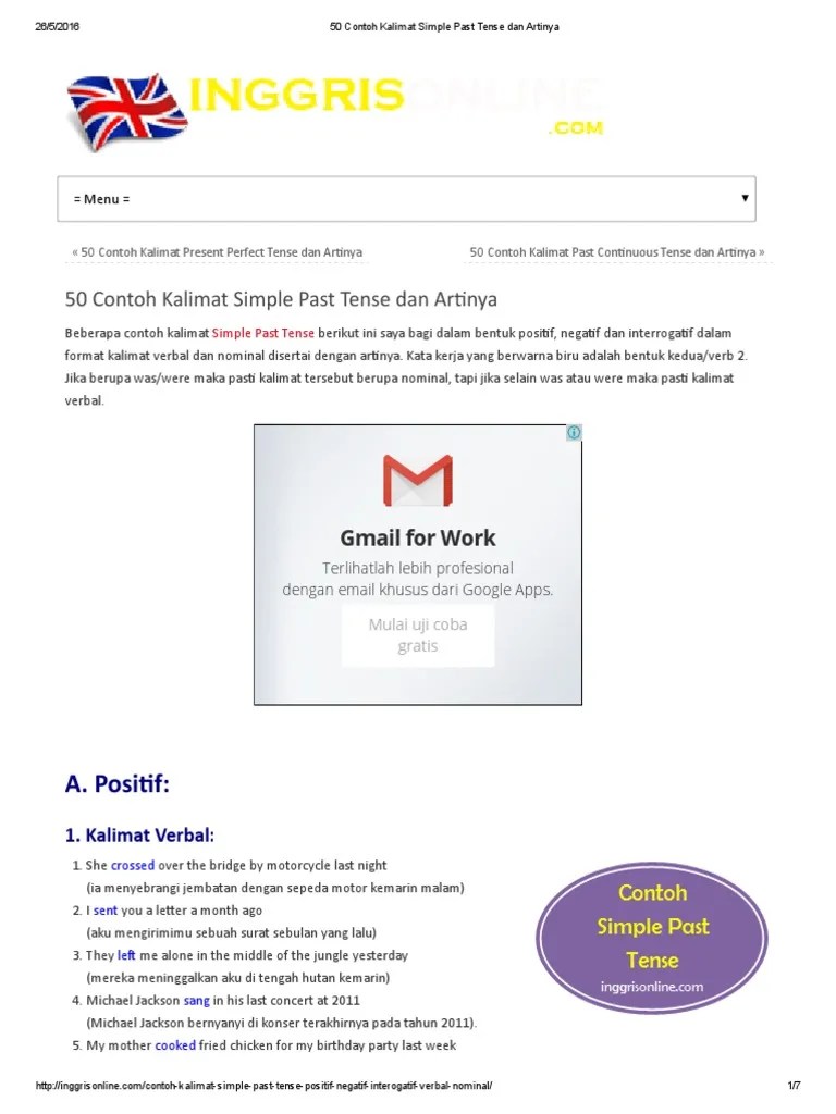 20 contoh kalimat past tense. Definisi, rumus, contoh kalimat dan soal latihan simple past tense terlengkap, semoga dapat bermanfaat dan membantu anda memahami simple past tense. Yaudah kalau gak mau, ini untuk yang mau saja yaaaa. Contoh simple past tense bahasa inggris menjadi sangat penting karena menjadi dasar untuk memahami narrative text yang penuh dengan muatan moral value. Pada contoh kalimat simple past tense dalam bentuk positif ini, bisakah sobat mengetahui mana kalimat verbal (menggunakan kata kerja) & kalimat non verbal.
